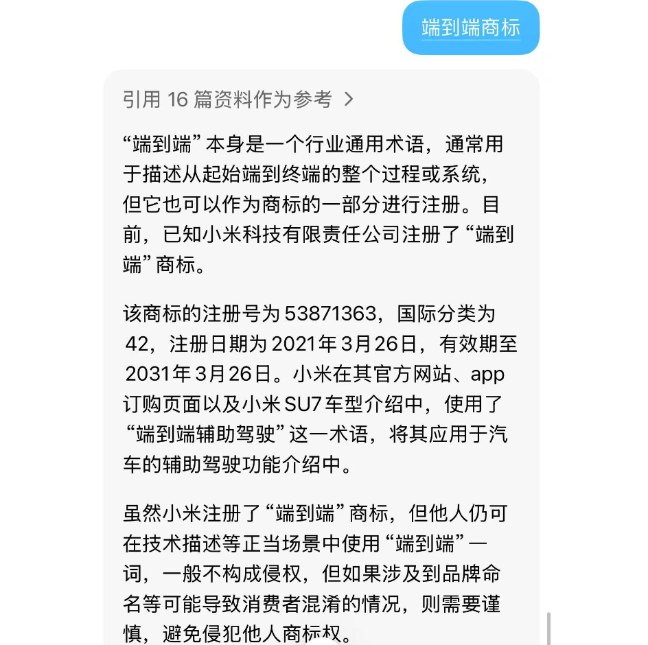 和“车规级纸巾盒”一同被送上热搜的,是有大量自媒体涌入网络平台,称小米注册了“端到端商标”,我们在网上检索到的有限信息是: