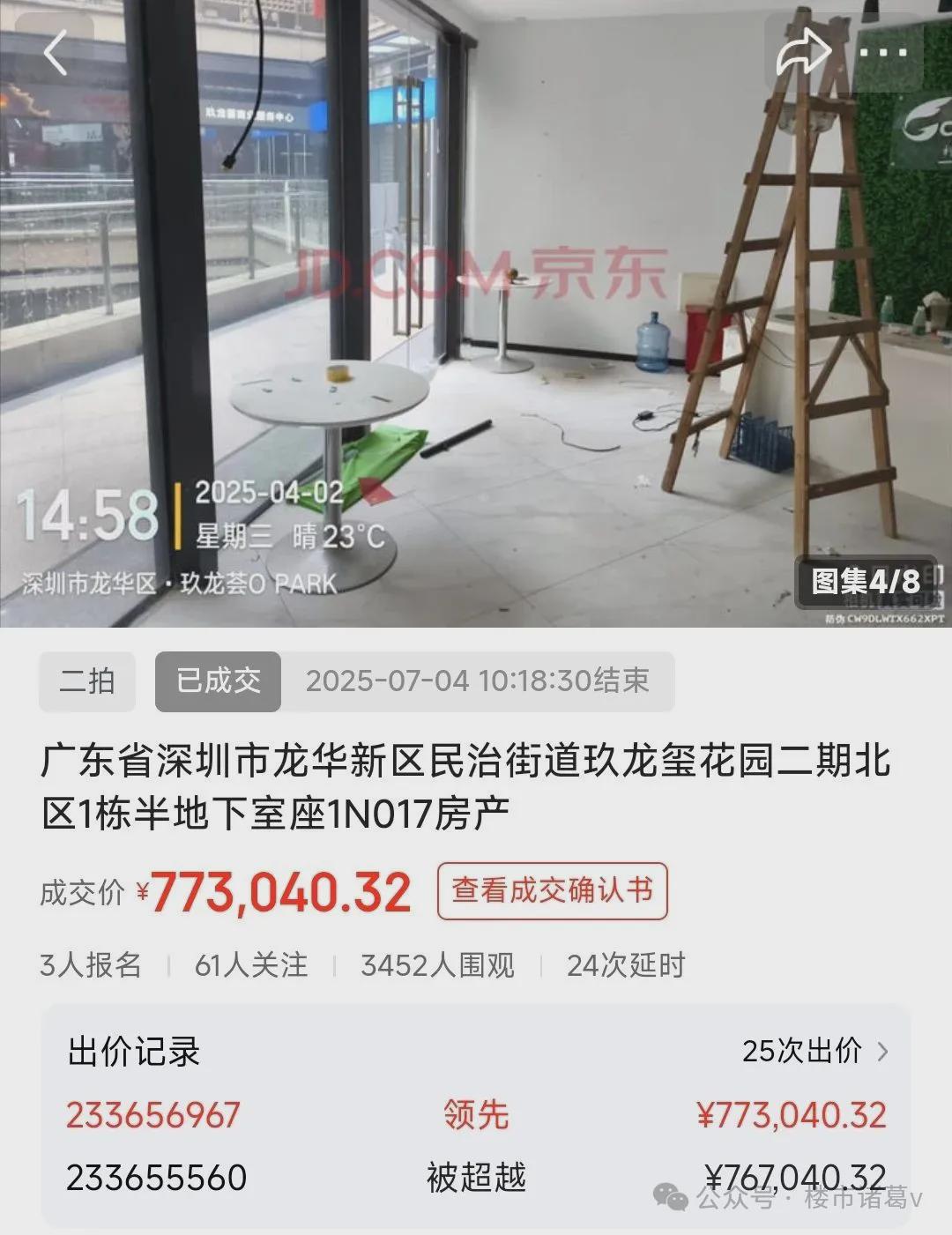 龙华玖龙玺花园一套建面约40㎡商铺,原业主于2017年以504万买入,八年供楼200多万,总成本超700万。如今,这套商铺仅以77万法拍成交。