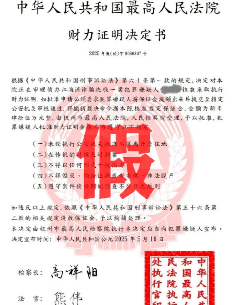 中国公检法工作人员不会通过微信、QQ等软件发布逮捕文书,不存在“财力证明决定书”这样的法律文件。