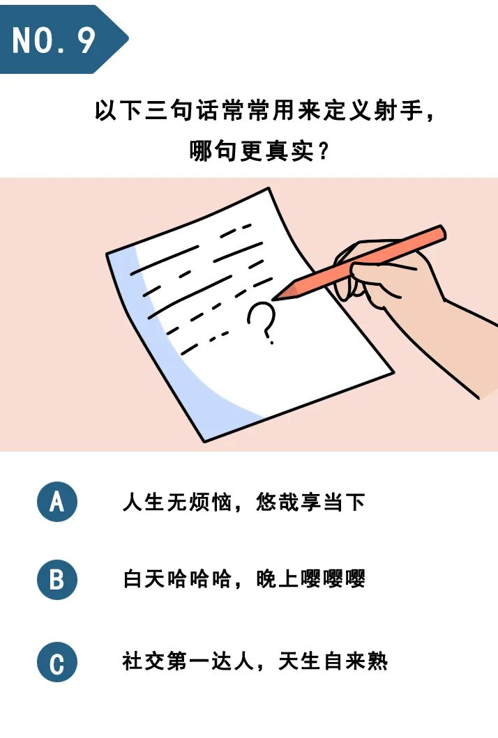 答案:B。射手并没有大家所认为的那么开朗外向,常常被一种莫名的悲伤笼罩。独自一人时才会卸下伪装,尽情释放自己。