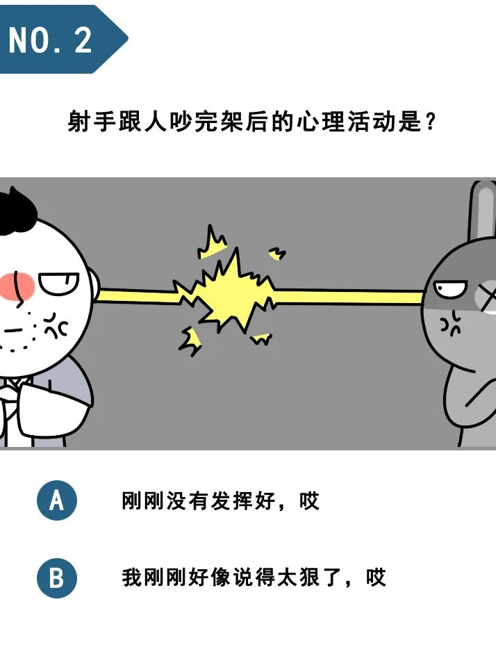 答案:B。射手一生气狠话就会疯狂输出,但事后就后悔,怕自己的行为给别人带来伤害,继而陷入无休止的自责内疚中。