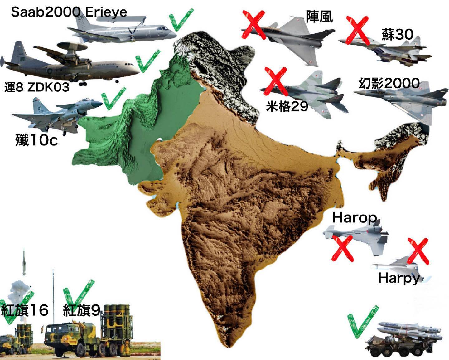 法国的“阵风”俄罗斯的苏-30MKI英国的“美洲虎”本国光辉战机以色列的“费尔康”预警机俄罗斯的S-400防空导弹(此次冲突据称被巴方摧毁2套)