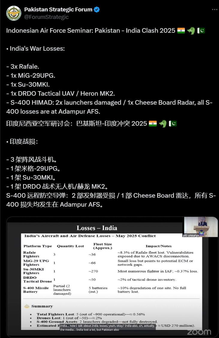 6月10日,在印度尼西亚一所大学举办的关于前不久印巴冲突的研讨会上,这位担任印度驻印尼大使馆武官的上校,扔出了一枚重磅炸弹。他在回答提问时,非常直白地承认: