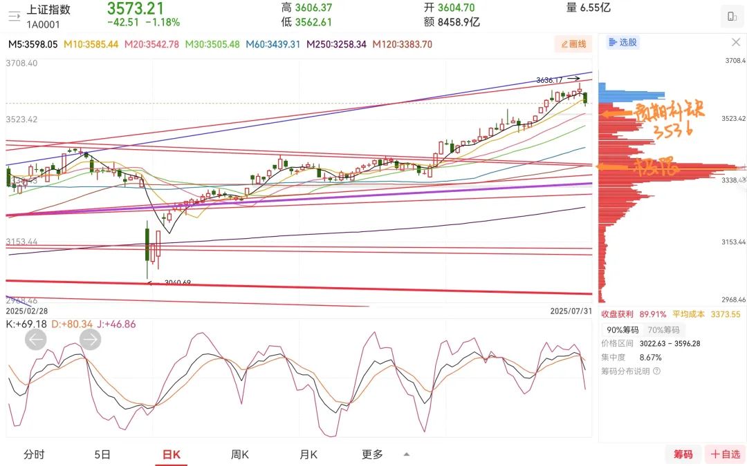 后续行情节奏与预判高度吻合:7月23日上证指数如期触及3600点,自此之后,每日解盘均反复提示“3600点之上不追高”,并强调下方3536点的缺口在一个月内大概率会回补,为短期操作划定了清晰的风险边界。