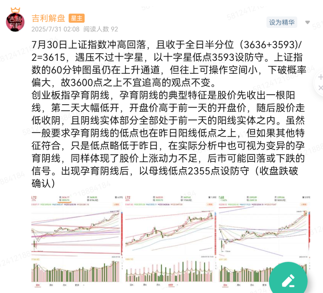 时间来到7月30日,市场信号出现显著变化:上证指数冲高至接近上方压力线后回落,收出一根十字星;创业板指则收出孕育阴线。这两大信号被明确判定为“本轮上涨中确定性较高的转弱信号”,并同步给出具体防守策略——上证指数以3593点为防守位,创业板指以2355点为防守位,为调整风险设置了“预警线”。