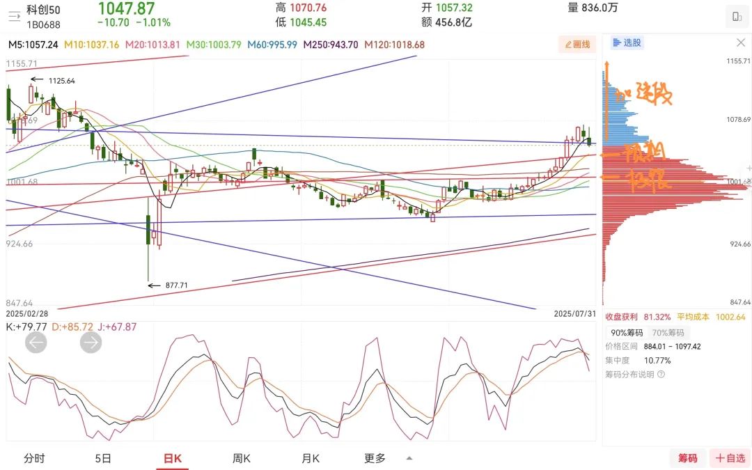 科创50:突破后的回踩,下方无缺口,本身调整空间就相对有限——即便回踩至“头肩底”形态的颈线位,下行幅度也较为可控。待调整结束后,大概率将开启波段行情,进入加速上涨阶段。