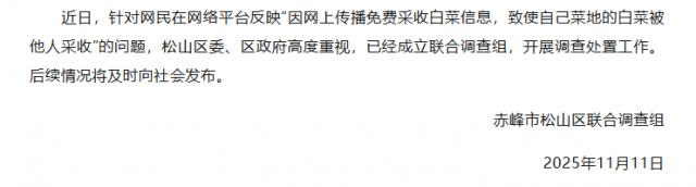 11 日晚,赤峰市松山区发布情况通报,称针对网民在网络平台反映"因网上传播免费采收白菜信息,致使自己菜地的白菜被他人采收"的问题,松山区委、区政府高度重视,已经成立联合调查组,开展调查处置工作,后续情况将及时向社会发布。
